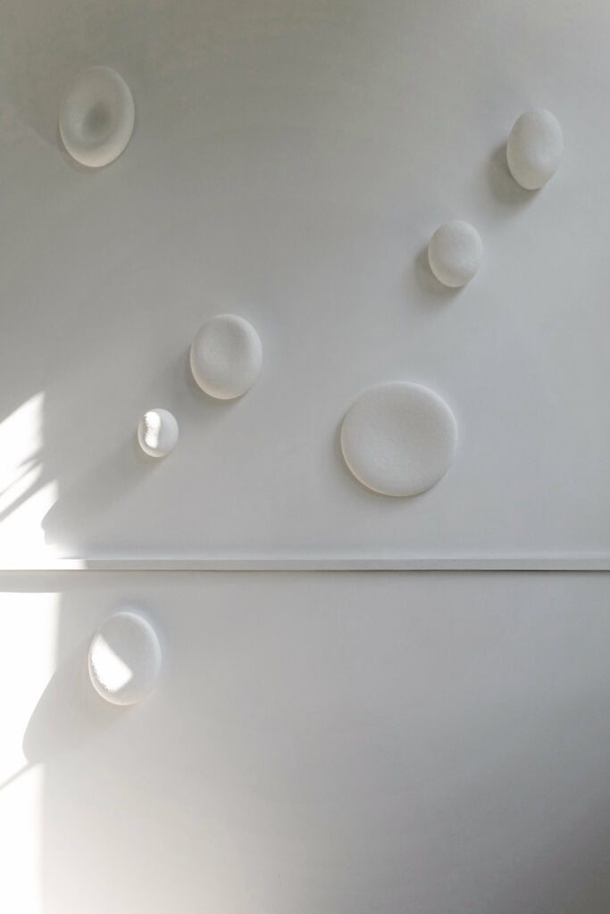 Gegroepeerd in de ruimte kiezen de ronde vormen zachtaardig positie. Yumiko Yoneda plaatst haar beelden met afgewogen tussenruimten, personages in een compositie. Haar objecten vormt ze uit pretentieloos polystyreen, dat ze met de vingertoppen een tactiele huid geeft van gips en modelleerpasta. Rond en ovaal maar niet zuiver symmetrisch, zijn de witte of grijze sculpturen zowel delicaat als karaktervol. Ze stralen rust uit, zijn introvert en toch open.