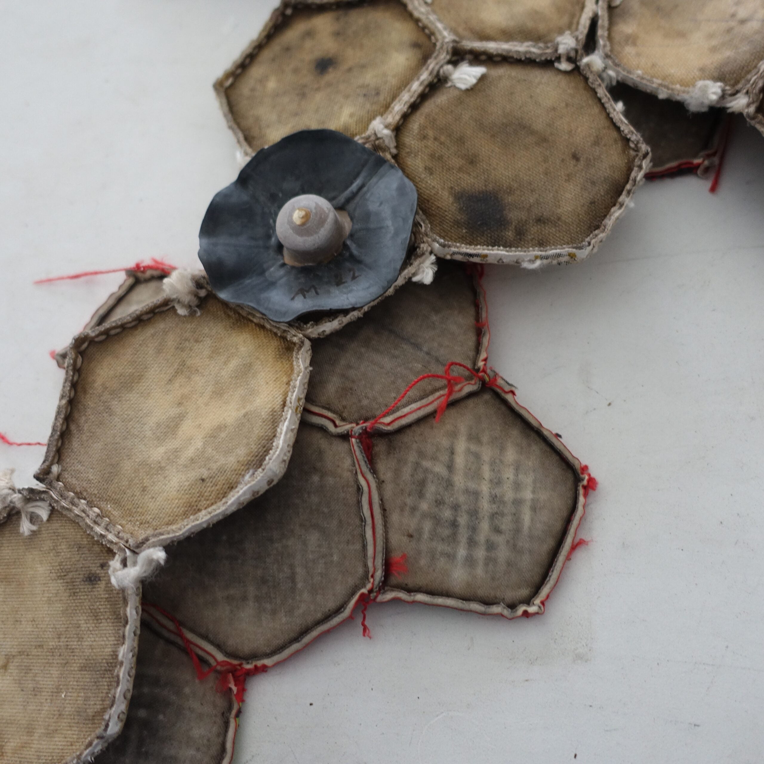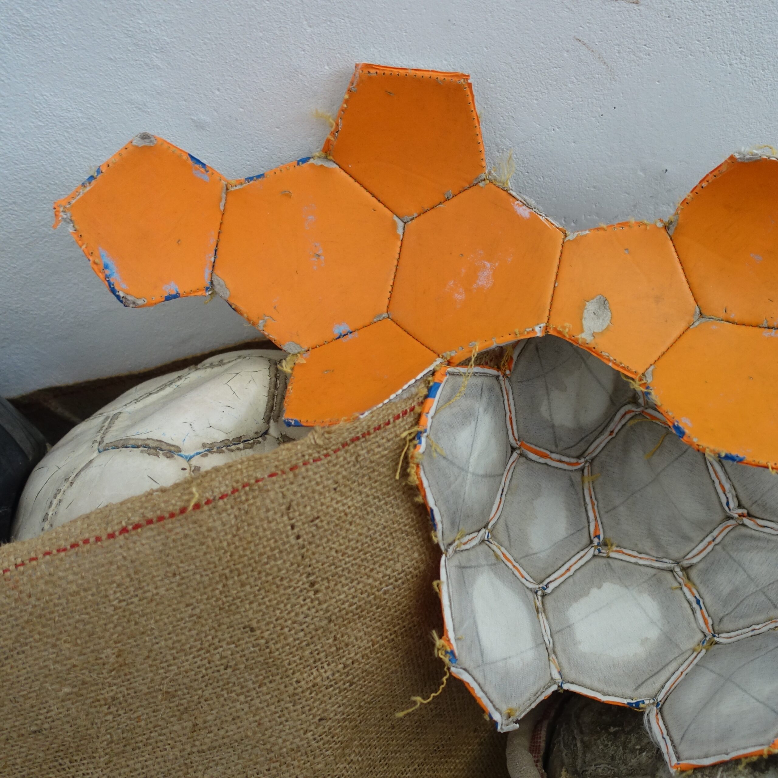 Dertig uitgespeelde ballen rolden naar haar atelier. Ballen met verschillende structuren: de Buckminster, de Teamgeist, de Tango. Een aantal van die ballen deconstrueert Astrid doelbewust. Zij fileert de voetbal, ontleedt de structuur tot op de draad, bekijkt het spel van binnenuit. Ze vindt sporen van de tijd: aantekeningen van de makers, slijtage door de duizenden trappen tegen het leer. De ziel ligt bloot, god is rond. Er gaat een wereld voor je open.