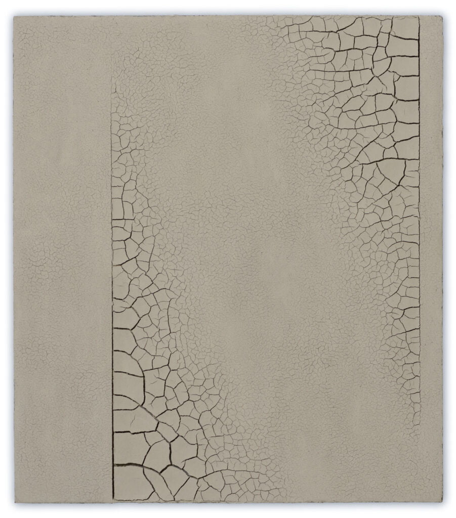 Gebarsten grond, de barsten gevormd in een regelmatig maar niet strak geometrisch patroon. Hein van Delft maakt en laat ontstaan.