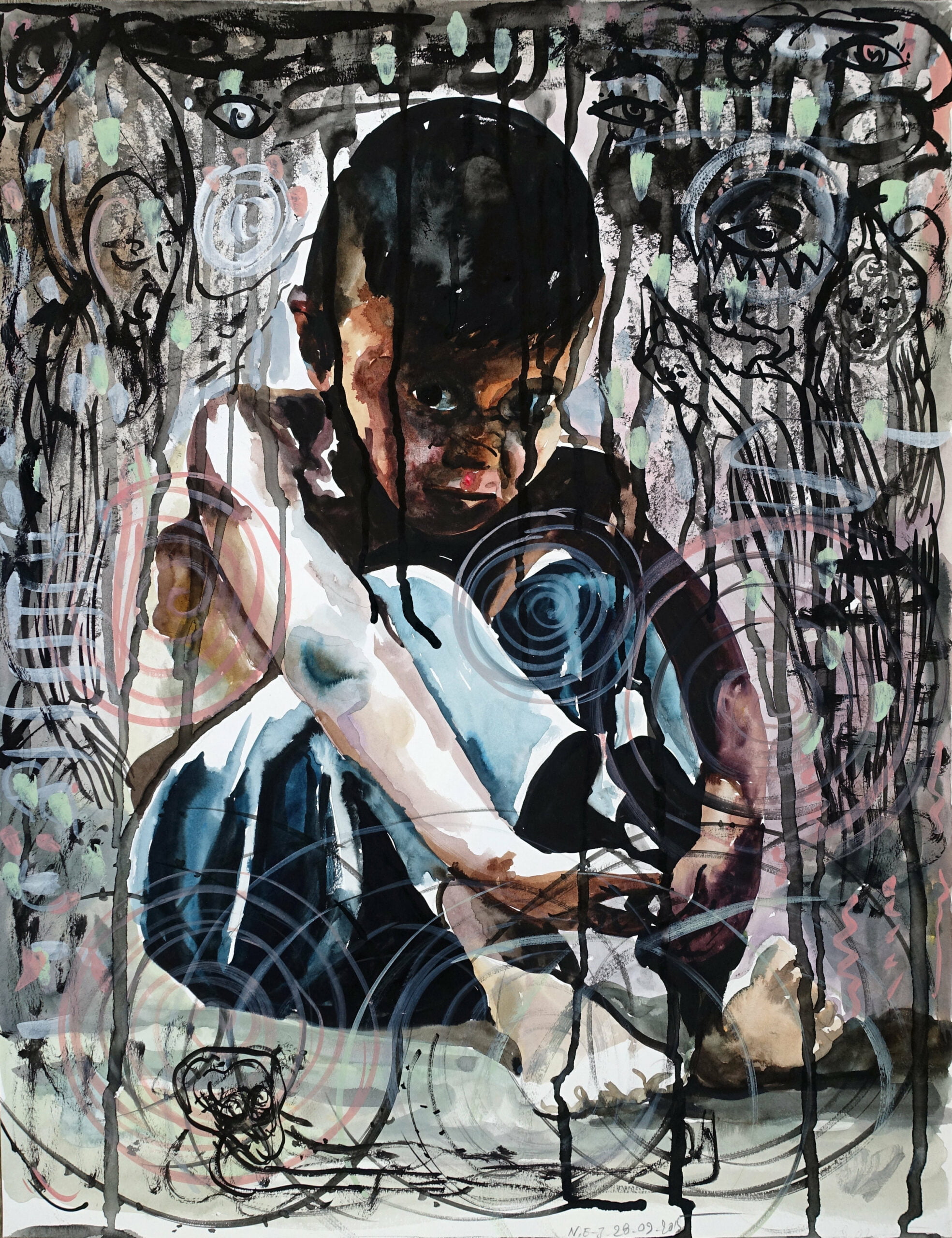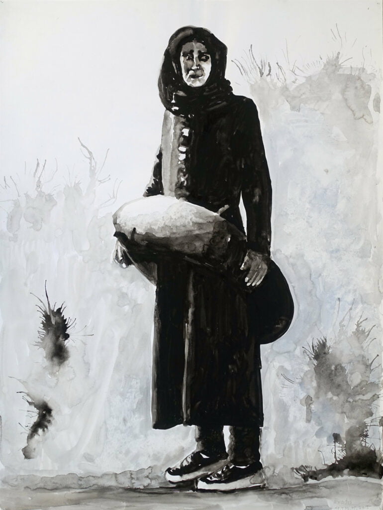De artistieke weg die Nour-Eddine heeft afgelegd is een lange. Ik herinner me zijn werk nog uit de jaren tachtig in het Haags Centrum voor Actuele Kunst. Dat was mijn eerste kennismaking met zijn werk. Verder zie ik natuurlijk geregeld werk van hem opduiken in het echt, bij Galerie Maurits van de Laar in Den Haag, en virtueel via Facebook. Door de jaren heen heeft hij de mensenwereld steeds meer geopend en naar zich toegehaald, begonnen als hij is vanuit de achtergrond van de Islamitisch-Marokkaanse kunst. Die kunst wordt door veel Westerse kijkers overigens vaak versleten voor alleen maar prachtlievend en decoratief, vol met vernuftig slingerende arabesken. Wat daarbij maar al te vaak vergeten wordt, is dat er in die kunst wel degelijk betekenis zit, sterker, dat de abstractie in de Islamitische kunst voortkomt uit betekenis. In Nour-Eddine Jarrams werk zie je een wisselwerking tussen het abstracte lenige lijnenspel en de realiteit die het tracht te vatten. Nour- Eddine heeft zich inderdaad laten leiden door de dingen die hij ziet in foto’s en andere beelden, maar hij heeft die beelden niet simpel nageverfd om als kunstenaar ook eens iets te zeggen over vluchtelingen. Daarvoor is de stroom van werken simpelweg te groot. Het onderwerp houdt hem intensief bezig en in zijn aquarellen zie je dat hij voor iedere groep mensen – het zijn vaak groepen of groepjes – tracht een andere vorm te vinden. Hij beslist steeds weer anders over het kleurgebruik, het donker en het licht en de monumentaliteit van de compositie, want ieder werk lijkt hier een monument te moeten zijn. Monumentaliteit zegt niet per se iets over de grootte van een werk. Een groot monument kan je toeschreeuwen, terwijl een kleine maar monumentale compositie je aandacht onweerstaanbaar naar zich toe kan trekken om het van dichtbij te bekijken.